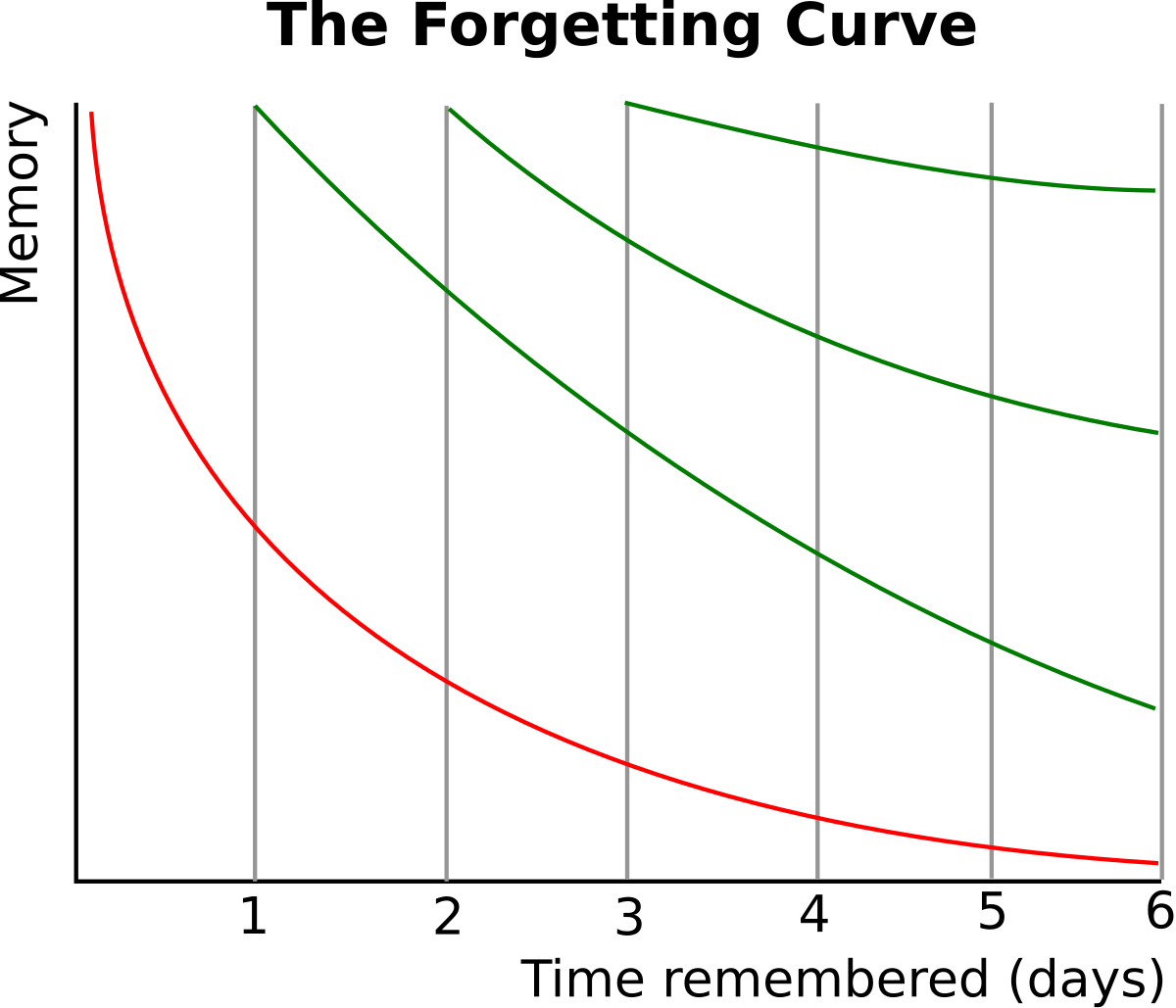 안키의 가장 큰 매력은 간격 반복 학습 시스템(Spaced Repetition System, SRS)입니다. 이 시스템은 에빙하우스의 망각 곡선을 기반으로, 우리가 잊기 직전에 복습할 수 있도록 카드의 복습 주기를 자동으로 조정해줍니다.